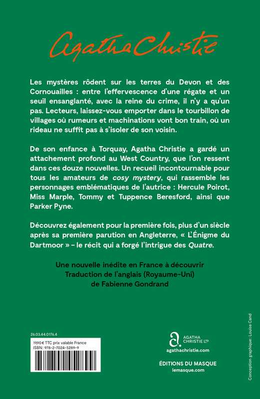 De son enfance à Torquay, Agatha Christie a gardé un attachement profond au West Country, que l’on ressent dans ces douze nouvelles. Un recueil incontournable pour tous les amateurs de cosy mystery, qui rassemble les personnages emblématiques de l’autrice : Hercule Poirot, Miss Marple, Tommy et Tuppence Beresford, ainsi que Parker Pyne.