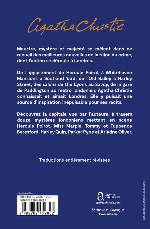 Meurtre, mystère et majesté se mêlent dans ce recueil des meilleures nouvelles de la reine du crime, dont l’action se déroule à Londres. De l’appartement de Hercule Poirot à Whitehaven Mansions à Scotland Yard, de l’Old Bailey à Harley Street, des salons de thé Lyons au Savoy, de la gare de Paddington au métro londonien, Agatha Christie connaissait et aimait Londres. Elle y puisait une source d’inspiration inépuisable pour ses récits. Découvrez la capitale vue par l’auteure, à travers douze mystères londoniens mettant en scène Hercule Poirot, Miss Marple, Tommy et Tuppence Beresford, Harley Quin, Parker Pyne et Ariadne Oliver.