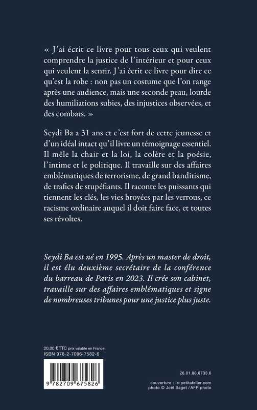 Seydi Ba a 31 ans et c'est fort de cette jeunesse et d'un idéal intact qu'il livre un témoignage essentiel. Il mêle la chair et la loi, la colère et la poésie, l'intime et le politique. Il travaille sur des affaires emblématiques de terrorisme, de grand banditisme, de trafics de stupéfiants. Il raconte les puissants qui tiennent les clés, les vies broyées par les verrous, ce racisme ordinaire auquel il doit faire face, et toutes ses révoltes.