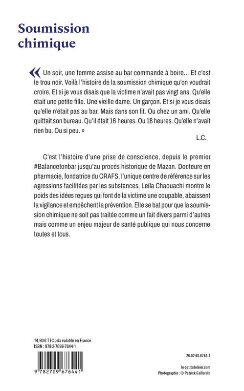 « Un soir, une femme assise au bar commande à boire... Et c’est le trou noir. Voilà l’histoire de la soumission chimique qu’on voudrait croire. Et si je vous disais que la victime n’avait pas vingt ans. Qu’elle était une petite fille. Une vieille dame. Un garçon. Et si je vous disais qu’elle n’était pas au bar. Mais dans son lit. Ou chez un ami. Qu’elle quittait son bureau. Qu’il était 16 heures. Ou 18 heures. Qu’elle n’avait rien bu. Ou si peu. »
